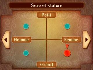 Vous pouvez choisir entre un Homme et une Femme. Cela affectera votre apparence ainsi que les personnages avec lesquels vous pourrez vous marier.
