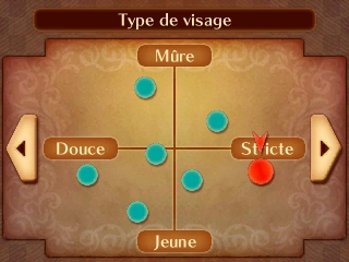 Modifie les expressions des yeux, du visage, et du nez parmis les 7 visages allant de Doux à Strict ainsi que de Jeune à Mûr.