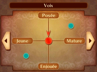 Vous avez le choix entre 3 voix(5 dans la version japonaise) allant de Jeune à Mature ainsi que de Posé à Enjoué.